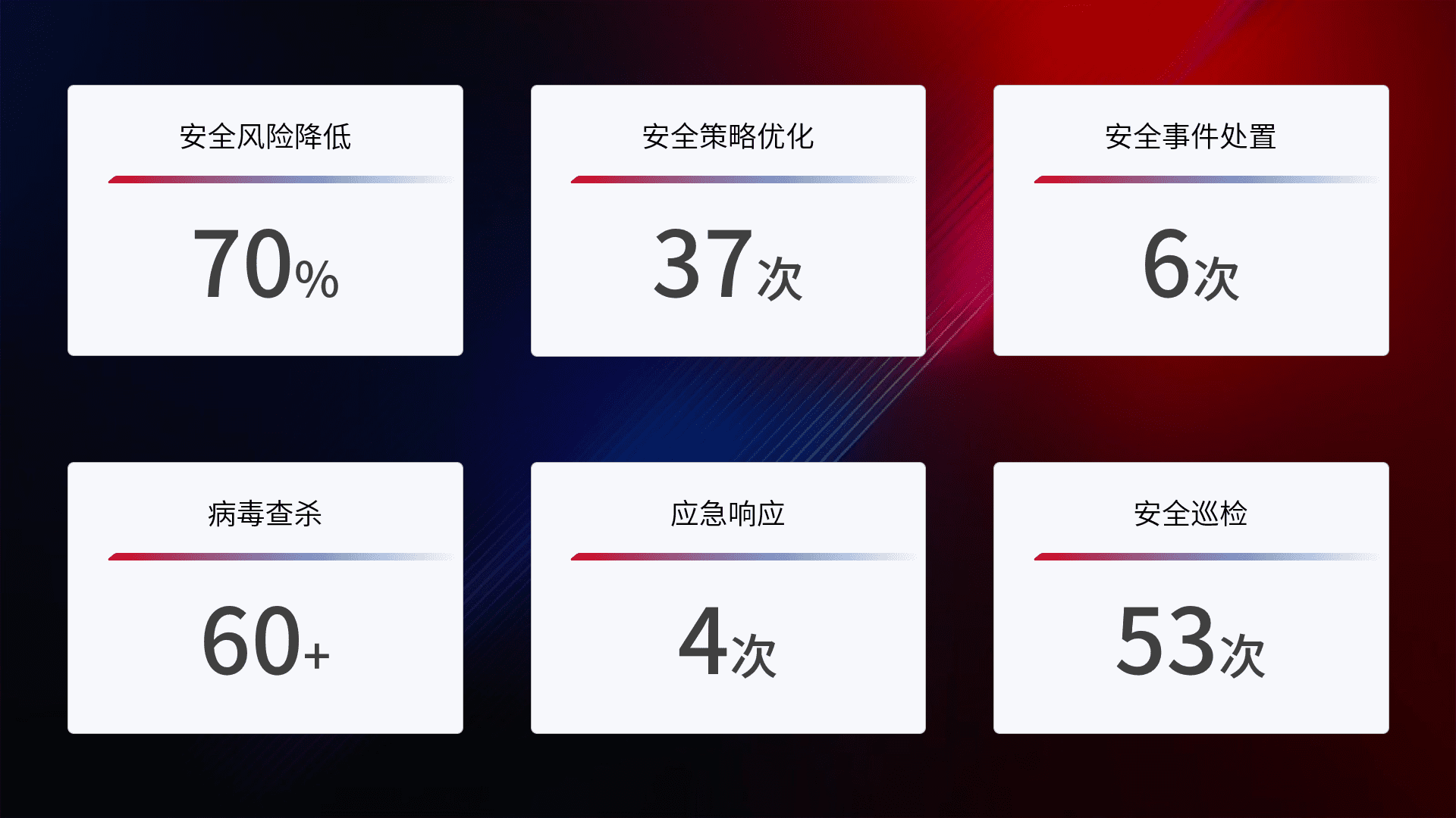提供全面的安全事件报告体系,,,包括处置报告、、、、周报、、季度和年度总结,,结合持续监控,,帮助客户深入了解网络安全状况。。